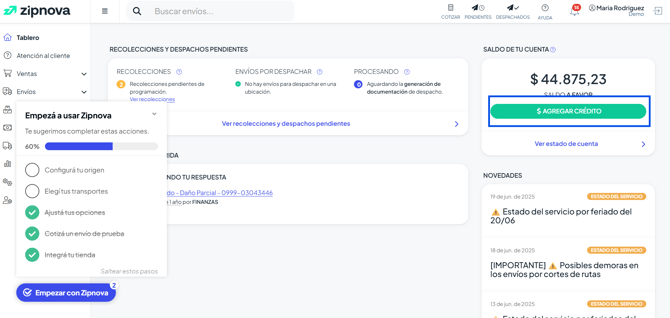 Para que los envíos avancen, siempre debe haber crédito en la cuenta, caso contrario, el sistema no permitirá descargar la documentación necesaria para el despacho.