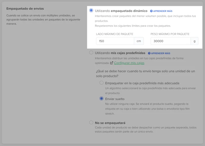 Cuando un envío está compuesto por varios productos (o múltiples unidades de un mismo producto), la funcionalidad de empaquetado dinámico permite determinar automáticamente la mejor forma de agruparlos en paquetes, optimizando espacio y costos.