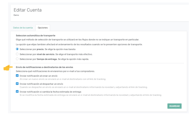 En la solapa Opciones, buscá el apartado Envío de notificaciones.
